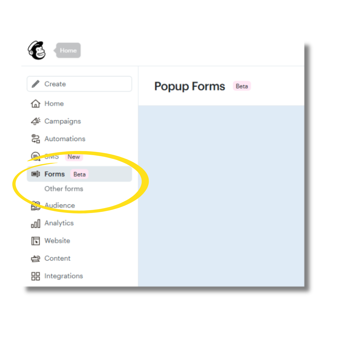 Since the introduction of Mailchimp’s powerful new Pop-Up forms, the side-bar Forms section now contains two parts. The default takes you to the Pop-ups dashboard - your list of new-style pop-ups and performance reports etc.