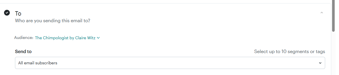 Click on where it says To, and instead of sending to “All email subscribers”, click on the tiny arrow on the right hand side, and go to SEGMENTS. A list will appear, which includes the RESEND: […] segment you just saved. Select that.