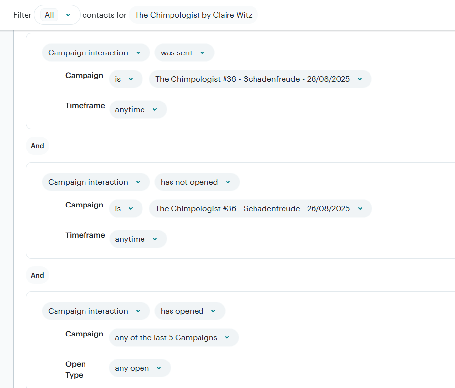 Now Mailchimp segments are a whole subject on their own, but the parameters can include how people interacted with your emails. Here’s an example of a segment that as the following criteria: