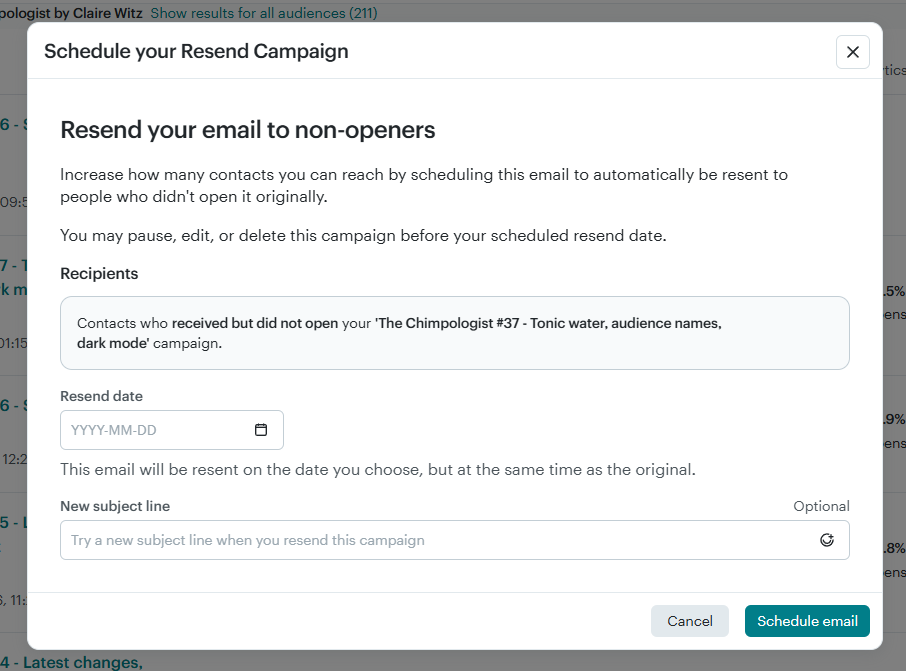 After you’ve sent an email campaign from Mailchimp, it will often give you a nudge to “resend to non-openers” - in fact there’s even a little option to “Schedule Resend” in the dropdown menu alongside each campaign: